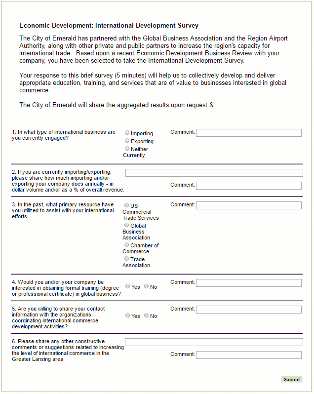 The Survey Center allows you to create custom surveys and questionnaires and deliver the questionnaires (to you or vendors) during site visits, contract reviews, or employee interviews. Surveys may also solicit information from the vendor community; such as outreach events or disparity study questionnaires. The results of the surveys are stored in the database for reporting and/or trend analysis. Once a survey is created it can be used many times.