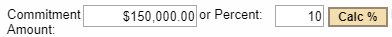 The percentage commitment as a percentage and dollar amount. When entering a sub, only supply one or the other then click "Calc". When viewing or editing both will show. |