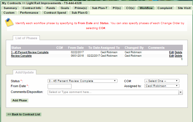The workflow tab tracks the status of the contract. The statuses are configured in PRISM and as a contract completes a phase of your workflow, the status may be changed to reflect it. There are two sections: The List of Phases Section and the Add/Update Section. The List of Phases section shows the phases that are current or have been completed. The Add/Update Section adds a new phase to the contract. This tab is not part of the contract entry process but is part of the contract review and update process.
