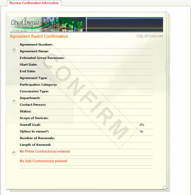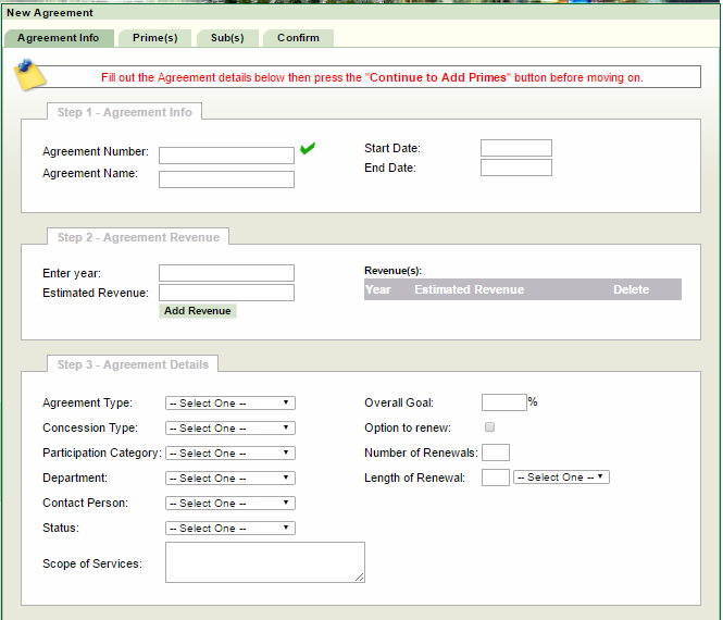 Adding an agreement consists of several steps. PRISM will guide you step by step through the process. The process begins with adding the agreement profile information. Adding concessions prime contractors to the agreement is next followed by adding concession subcontractors. Finally, the entered data is confirmed and the agreement is in place.
