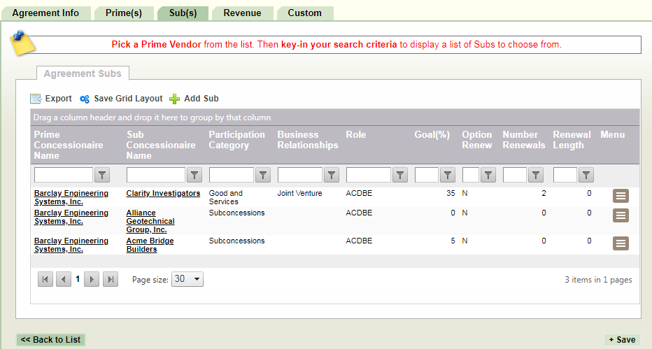 The Sub(s) tab is where Sub Concessionaires may be added or viewed, as well as the prime that they are subcontracting to.