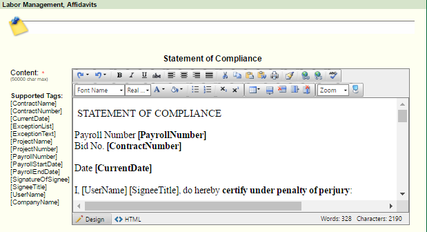 The Statement of Compliance is presented to the vendor when they are certifying a payroll.  The default Statement of Compliance will satisfy most jurisdictions legal requirements.  However, if this statement needs to be modified, it can by simply modifying the text in the area below the Statement of Compliance header.