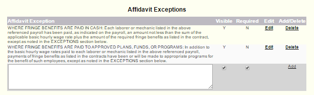 Affidavits are throughout labor management and certified payroll.   These affidavits require the vendor to agree with or take exception to certain exemptions.  In all cases the affidavits can be configured in one place and when appropriate will be presented to the vendor for affirmation.  There are three affidavits: