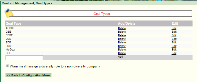 Goal Types are the specific goals that will be assigned to primes and subs on contracts. They are configured as goal types, however, during the assignment process, the vendor is assigned the role of the goal type. That is, Acme Construction's position is a sub and their role is an SBE. This nomenclature makes a clear delineation between the vendor's certification and their role on the contract.