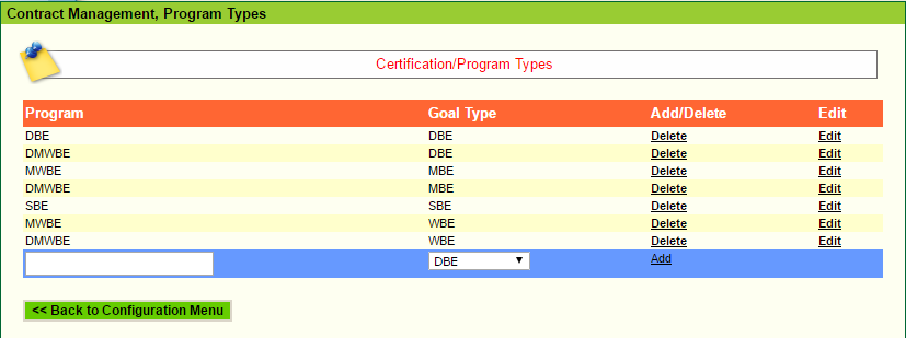 If there is a need to report on the DBE goal type, simply select the DBE Program and so on with the other Programs. This is simple. There is a need to report on MWBE with SBE spend collectively (with not double counting). Not so simple. Well, it is. Create another Program named "SMWBE". Add this to the Program configuration.