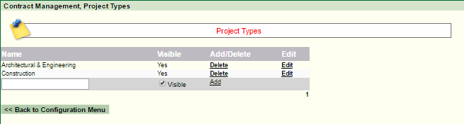Navigation: Reference Manual > The PRISM Modules > Contracts > Configuration > Project Types |