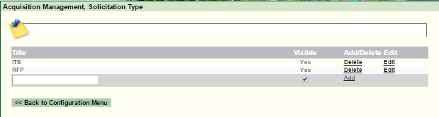 In the picture above two solicitation types are configured for usage (RFP and ITB).  Unchecking the Visible field will not show the solicitation type in the list.