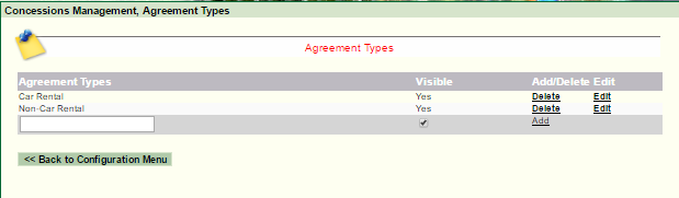Concession Agreement Types are configured by default with the Car Rental and Non-Car Rental options. Other options may be added here if they are required.