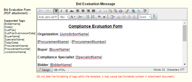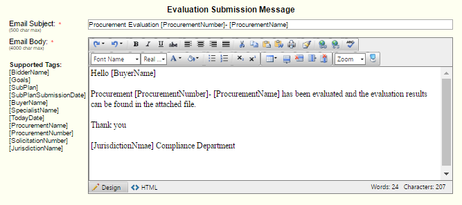 This notification contains the format of the individual bid evaluations. Where the notification above is the email indicating the the evaluation process is complete, this configuration formats the evaluation that is sent (PDF attachment) with each evaluated bid.