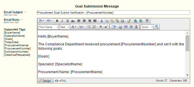 Configure the various notifications that will be sent during the procurement life cycle. Each of the notifications have "Supported Tags" that may be added to the notification. The sections below will discuss each notification.