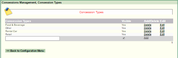 Concession Types are configured to match the CFR report requirements. Although you may add concession types, modifying the existing concession types may alter the CFR reporting spend.