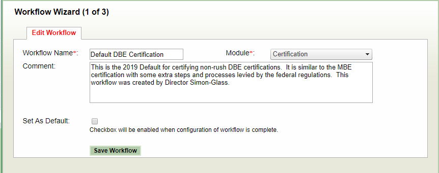 This is also where you can set a Workflow as the default Workflow (this check box will be grayed out until the configuration of the workflow is complete). Select the module that the workflow will be used (Certification, Contracts).