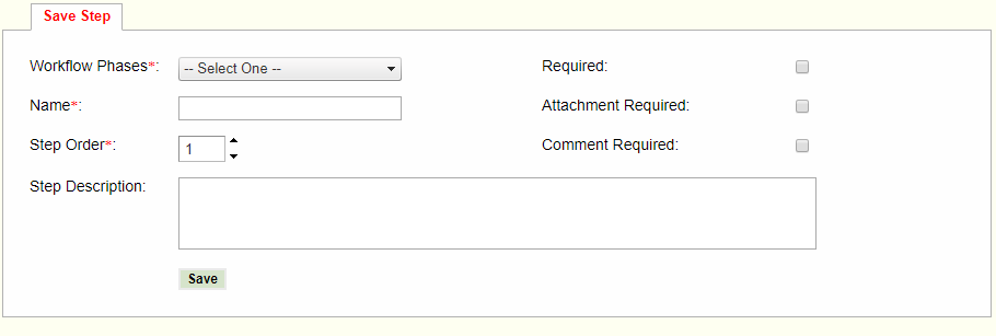 This form is completed for each step (above). Click 'Save' to save the step and populate the list (above).