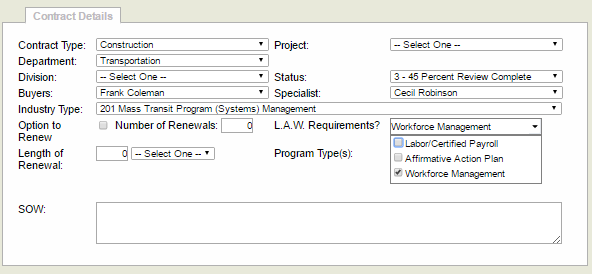 Assigning the program to contract is performed from the contract info tab, Contract Details section. Simply, identify the contract as having workforce requirements, select the program(s) that are applicable to the contract, and click save.
