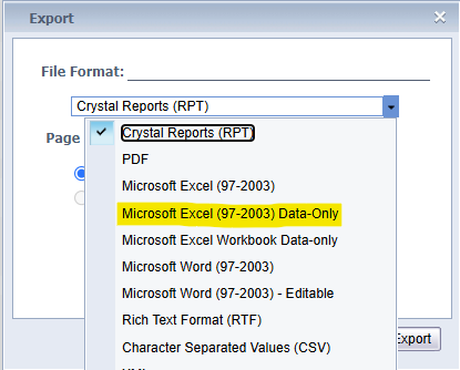 4. Select 'MS Excel (97-2003) Data Only' as the export option