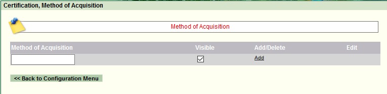 Navigation: Reference Manual > The PRISM Modules > Certification > Configuration > Method of Acquisition |