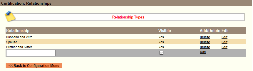 Navigation: Reference Manual > The PRISM Modules > Certification > Configuration > Relationships |