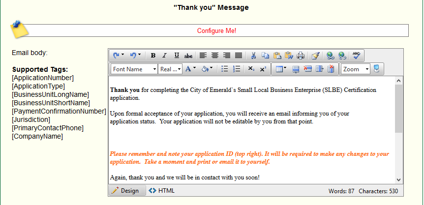 This is the page that allows you to configure the messages that are sent out as a part of your Online Application.