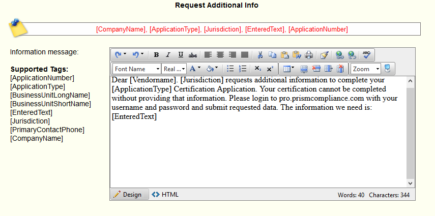 Request Additional Info: This message allows you to configure your request for a vendor to submit additional information through the UI.