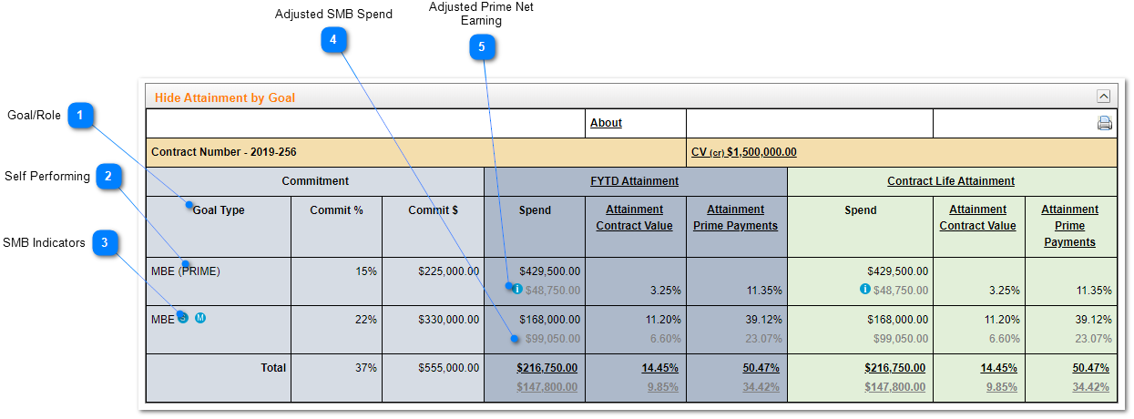 If the prime is self performing, the adjusted prime net earnings will appear (in gray) below the actual spend |