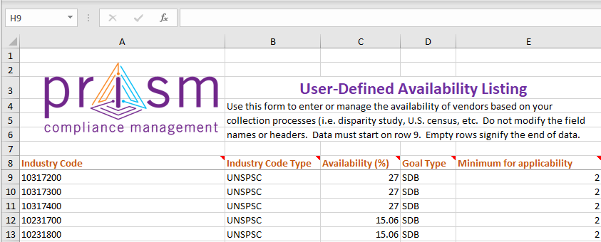 E. Minimum for Availability - The minimum number of certified vendors that must be found in PRISM in order for the Availability % to be considered in the goal setting calculations. Otherwise the availability is determined to be 0% essentially forcing the goal to 0%.