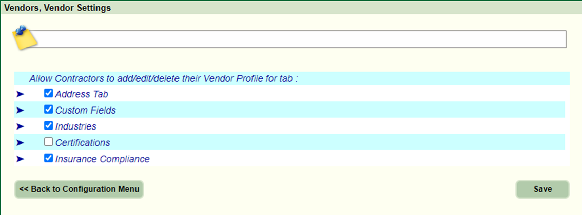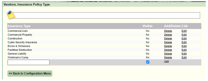This configuration allows a vendor to update their insurance information via the web. Otherwise the vendor would email updated policies to the contract specialist and the specialist would update the policy.