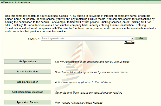 For example, "All Applicants" will give you a list of all EEO/AAP applicants. That is, all of the vendors that are submitting EEO forms. "My Applicants" has all of the book-marked applicants. "Add an Application" allows you to add a new applicant. "Search Applications" provides a Simple and Advanced Search of Applicants. "Application Correspondence" allows you to correspond with applicants via the PRISM Correspondence Center. "Applicant Reports" has all of the reports from the PRISM Ray Report Center.