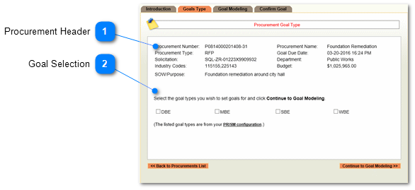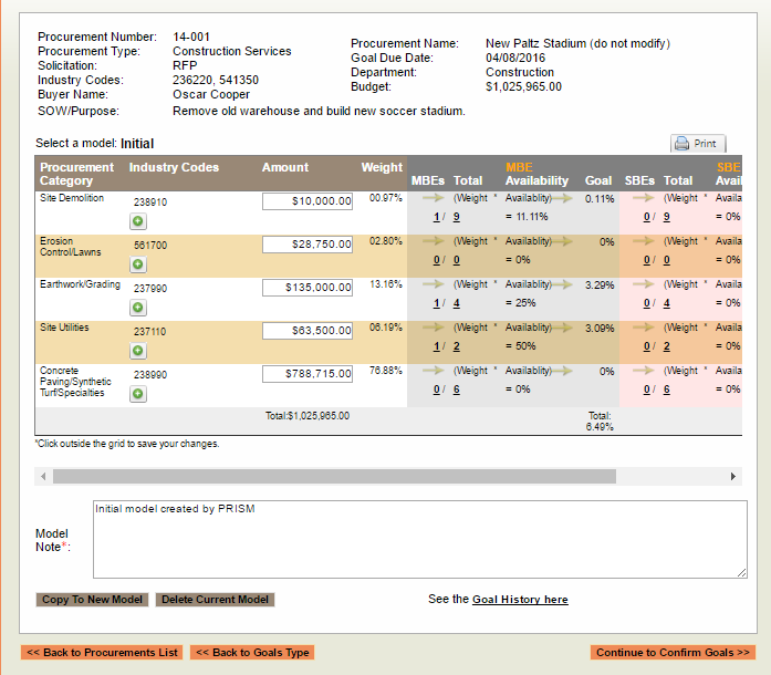 Note: PRISM will prepare the initial goal recommendation based on the goals selected and the information from the procurement categories. This is called the initial model