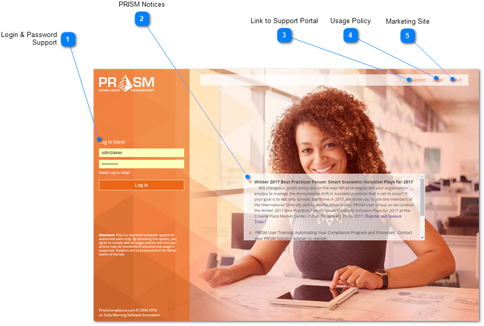 Entering the PRISM web address (URL) will produce this landing page. The landing page is full of information that will keep you up to date with PRISM and allow you to log into PRISM. Although the image and messages on the landing page may change with each login, rest assured that you are using the same PRISM portal.