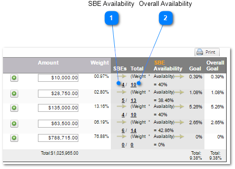 For each procurement category the goal-related availability is provided (as a link). In this case an SBE goal is being set so the SBE availability is provided for each procurement category. |