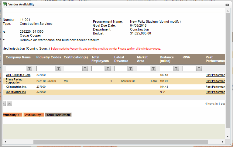 For example, a user can filter for all companies that are more than 150 miles away from the job site then remove those companies from the availability. Moreover, perform a filter on all the companies that responded that they are not ready, willing, and able by filtering for "No" in the RWA column then clicking the "Availability --" button. Want to remove companies that are too small for the opportunity, filter on size and then remove the companies.