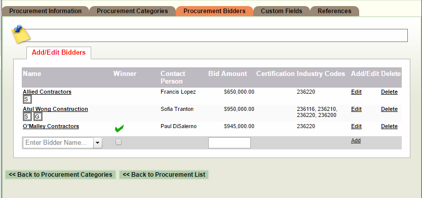Note: At some point the winning bidder should be identified. This can easily be done by returning this screen, clicking the 'Edit' link associated with the successful bidder, and clicking the check box in the 'Winner' column. This action facilitates identifying the prime contractor when the procurement information is pushed to the resulting contract.