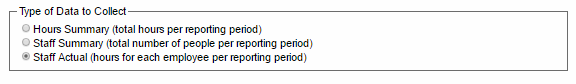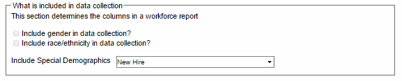 This option determines whether gender, race/ethnicity, and other demographics are included in the data collection. In most cases considering race and gender does not make sense. For example, if "Hours Summary" is the Type of Data, then including race or gender may not add anything serviceable. However, when the assumption that all the hours are going to a specific race and gender then it is appropriate. This is rare.