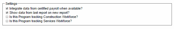 This option determines who is required to report, if primes can report for subs, and if a planned workforce report is required.