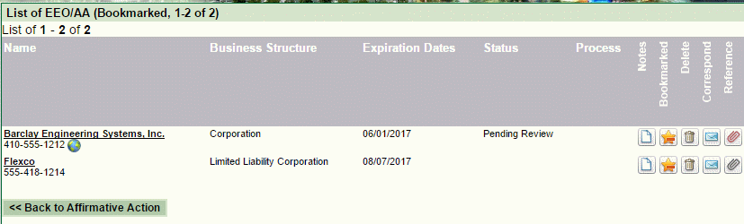 The Applicant Listing is a listing of vendors that have submitted an EEO form for review. The listing consist of: