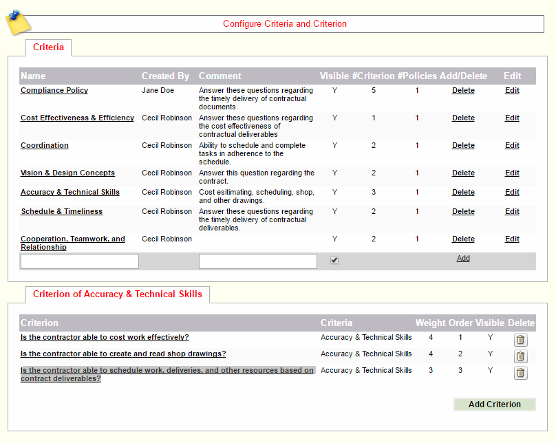 Below is a screen shot of a list of criteria.  The top tab has a list of criteria.  The bottom tab shows the questions associated with a criteria.