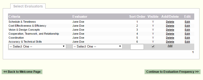 Lets establish a policy named Professional Services '17.  This policy, consisting of the criteria Schedule & Timeliness and Accuracy & Technical Skills, can be assigned to a contract and the prime of this contract will be evaluated using the five (5) questions associated within the two criteria.  Again, the policy has more information than the criteria such as, who will evaluate the performance, when the performance will be evaluated, and how the score is calculated.