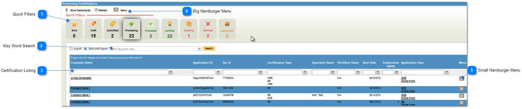 A thorough listing of certifications based on the key word search or the quick filter.  Filtering, sorting, and grouping are available for appropriate columns in the grid.