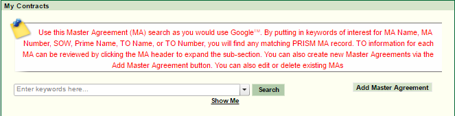 Task Orders (TOs) are individual SOWs that are assigned to the MA, contracts in essence. PRISM accomplishes this by associating contracts with the MA. However, once a contract is associated with a MA, it the contract is referred to as a TO to ease confusion. The TO has all of the attributes of a contract and will appear in the contracts list as a contract. Thus, in order to assign a TO to a MA, the TO must exists. Follow the rules for Adding a Contract then assign the contract to the MA.