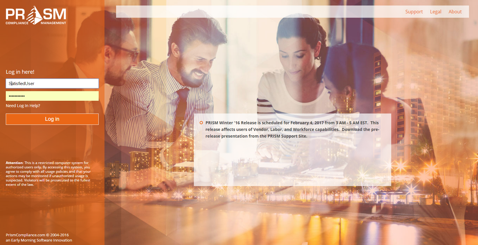 PRISM Compliance Management - Copyright © 2018 Early Morning Software, Inc. |