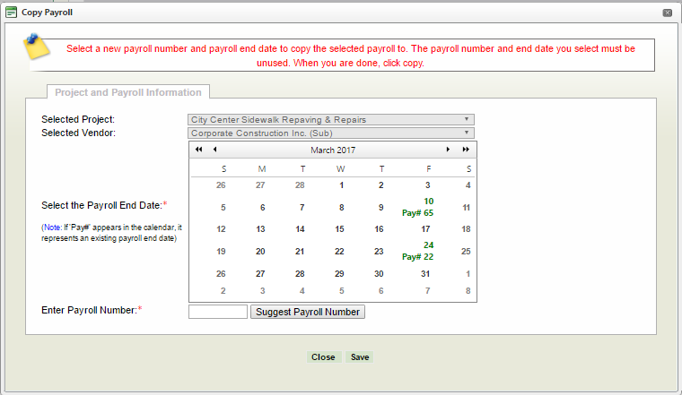 Many payrolls submissions are similar to the other weeks. For vendors that submit payroll manually this can be a gruesome task. The Copy Payroll feature allows the user to copy a payroll into a different reporting week. Just make modifications to the newly copied payroll then certify it. This reduces the amount of time it takes to submit a payroll because the data entry is already done.