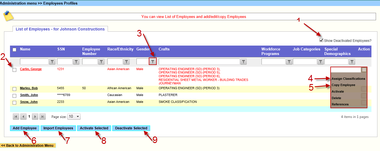 4."Assign Classifications" Navigates user to the page where Crafts can be assigned to the Employees. These crafts will be available for selection when adding Payrolls in Labor Compliance;