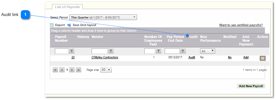 If your jurisdiction is allowing you to audit your payrolls you will see an audit link column in the certified and non-certified payroll listing.