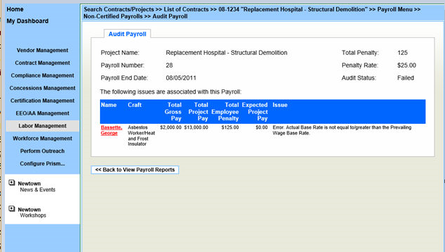 The PRISM Payroll Audit provides a means for you to determine if a specific payroll meets the prevailing wage and is a candidate for Payroll Certification. Your jurisdiction may choose not to allow a payroll to certify if it fails an audit. In this case, PRISM will perform an implicit audit of the payroll only when it is certified.