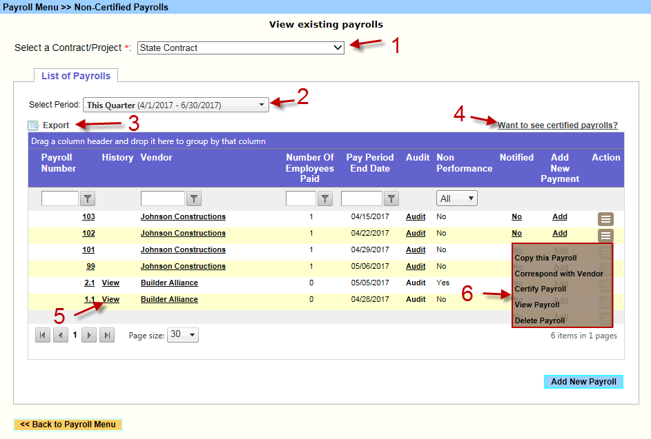 1. "Select Contract" used to choose the contract that the payrolls will be listed