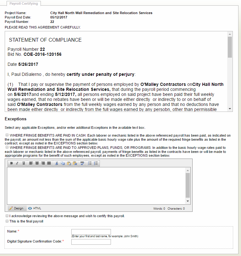 Navigation: Reference Manual > PRISM Functionality > Labor Compliance > Certify a Payroll |