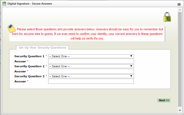 2.Click "Answer Security Questions..." Hint: The answer to the security question does not have to be true. However, you must remember what you answered.