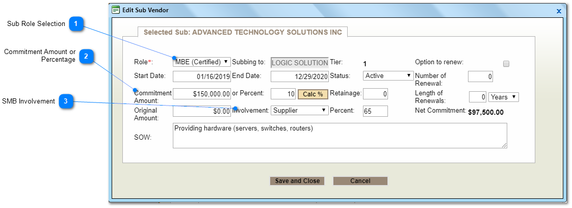 Net Commitment - The committed amount from a prime or sub to a particular sub (expressed in percentage and dollars).