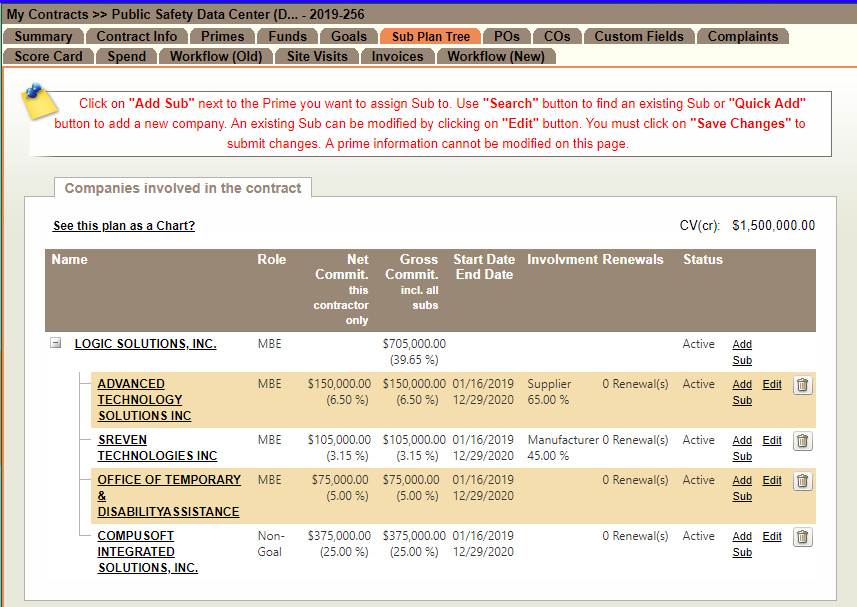 The Sub Plan Tree presents a tree representation of the sub contractor utilization plan. The prime contractor is the root of the tree and each sub is presented as a branch of the root. The first branch represents the tier one subcontractors. Subsequent branches are represented tier two, three, and so-on level subcontractors. Clicking the '