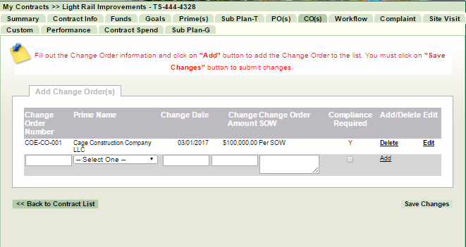 When adding or modifying a change order be sure to identify if compliance is required for the change order. That is, is the prime responsible for attainment on the change order amount? Simply affirm the "Compliance Required" box in the CO listing.